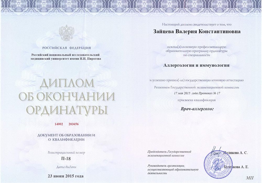 Российский национальный исследовательский медицинский университет имени Н.И. Пирогова (Аллергология и иммунология)